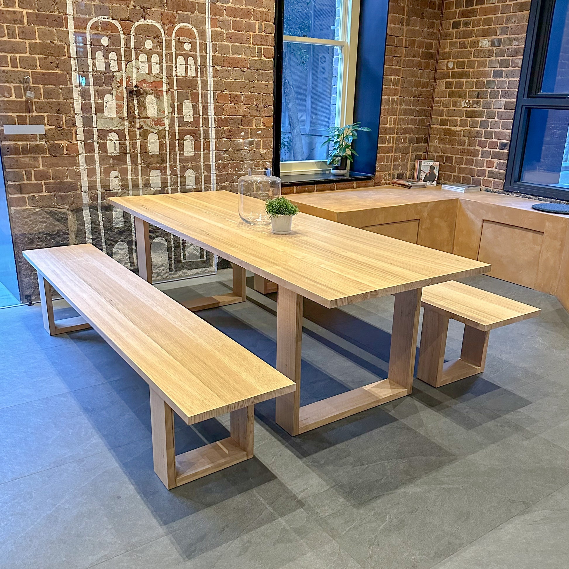 Custom designed benches and tables, crafted from sustainably sourced Victorian Ash feature grade Hardwood, at a sturdy 43mm thick.